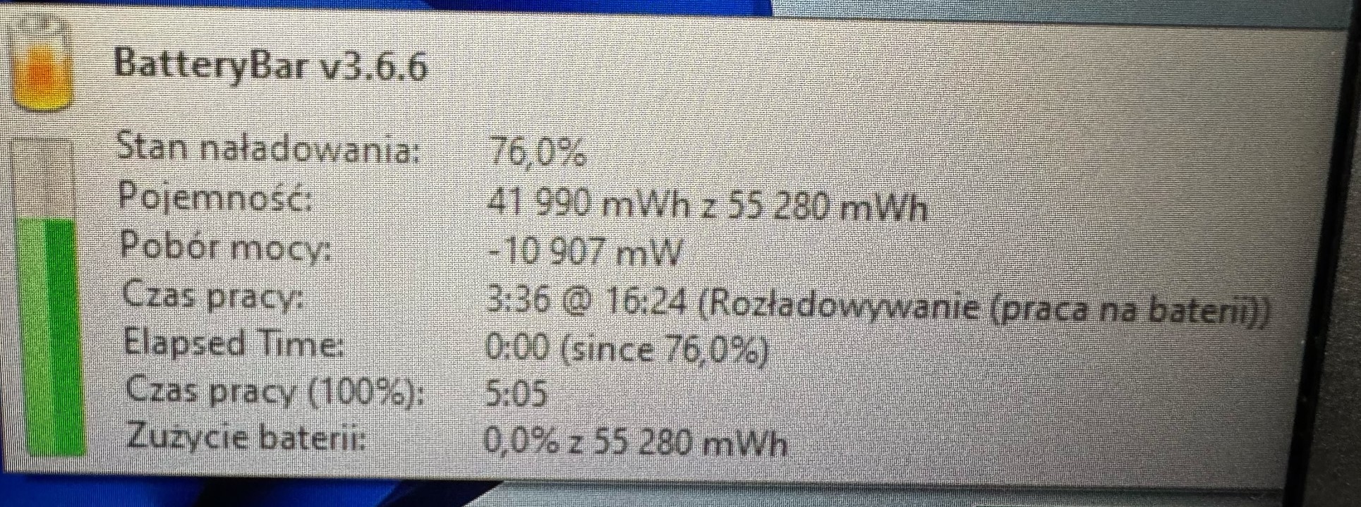 Czas pracy na baterii do 4 godzin (zdjęcie stanu baterii w galerii)